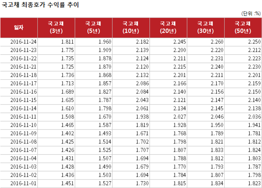 이날 국고채 3년물 금리는 1.811%를 기록하면서 연중 최고치를 갈아치웠다. 금융투자협회가 집계한 최종호가 수익률에서는 국고채 5년물이 1.960%, 10년물 2.182%로 나타났다. 20년물과 30년물, 50년물은 각각 2.245%, 2.260%, 2.250%를 기록하는 등 모든 만기에서 상승했다.