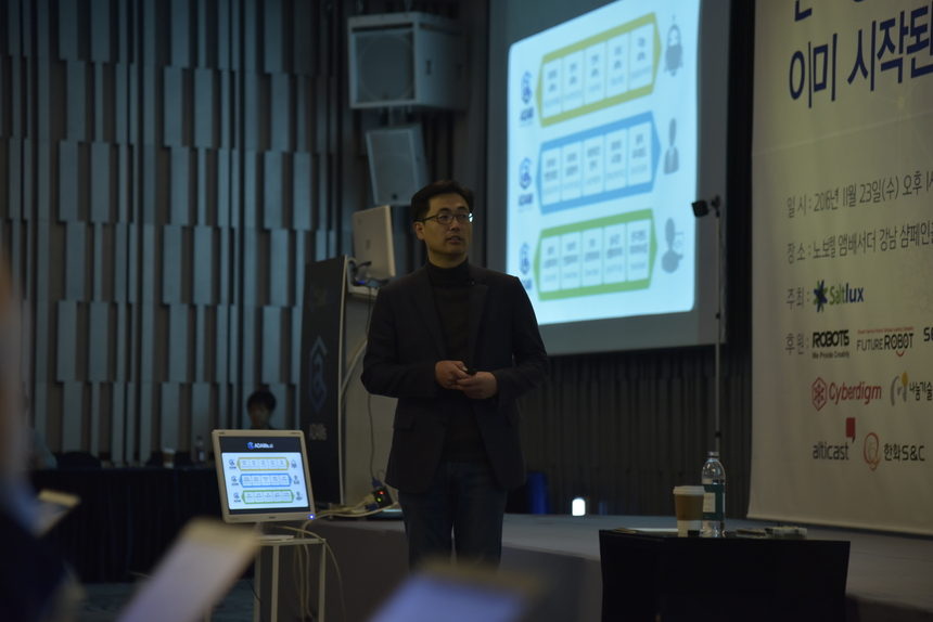 데이터 분석 전문 기업 솔트룩스도 23일 음성인식 기능을 담은 인공지능 오픈 플랫폼 아담(ADAMs)을 공개했다. 이경일 솔트룩스 대표는 발표를 시작하면서 아담에게 언어로 정보 검색을 지시하는 모습을 시연했다.