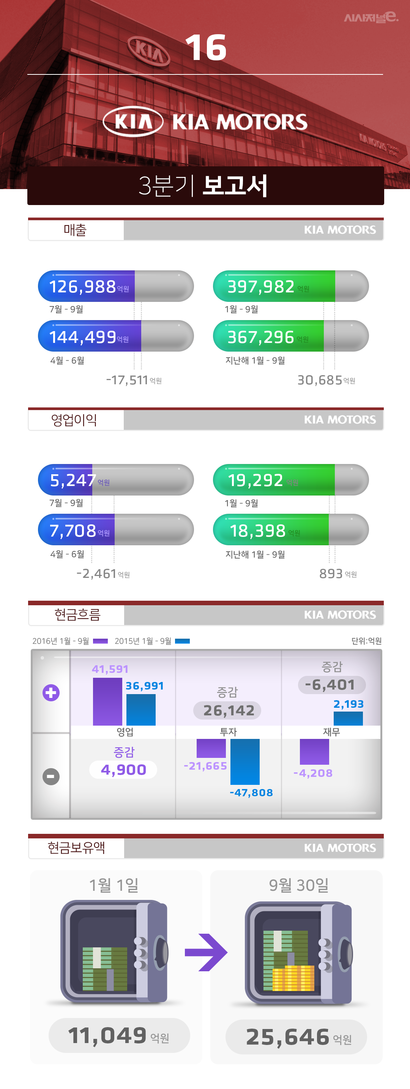 기아차 전체 매출에서 판촉비가 차지하는 비중이 4.6%에서 4.8%로 높아졌다. 투자활동 현금흐름은 2조1665억원으로 지난해 같은 기간 4조7808억원과 비교해 절반 넘게 감소했다. 전문가들은 러시아 브라질 등 신흥국 경기 부진, 엔화의 상대적 약세, 트럼프 보호무역주의 등 악재가 당분간 지속될 가능성이 크다고 보고 있다.