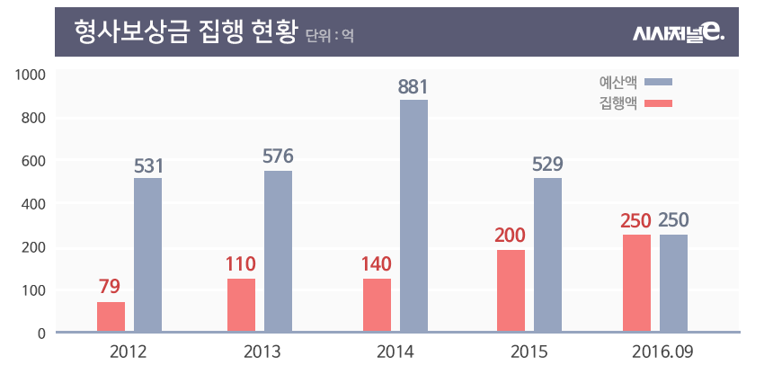 법무부가 제출한 내년도 예산안에 따르면, 형사보상금 예산은 275억 원이다. 올해 예산(250억 원)액에서 10% 커졌다. 하지만 그간 결산액과 비교하면 턱없이 부족하다. 지난 5년간(2011~2015년) 형사보상금 연평균 지급액은 550억 원으로 올해 예산은 평균 지급액의 절반에도 못 미치는 수준이다.