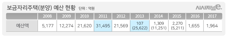 공공임대주택의 일종인 행복주택 2017년 예산은 2조5069억원(출자 1조1263억원, 융자 1조3806억원)이다. 이와 함께 기업형 임대주택인 뉴스테이까지 합세하자 공공분양주택인 보금자리주택의 설 자리가 더 좁아졌다.