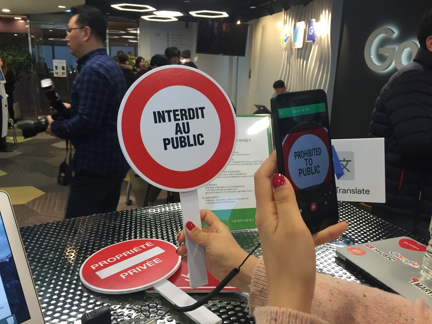 이해민 구글코리아 검색 부문 프로덕트 매니저가 불어 표지판을 카메라로 보여주자 카메라 속 표지판엔 영어가 적혀 있었다. 이 장면을 보고 청중들은 탄성을 냈다. 일종의 증강현실 서비스도 번역에 가미된 셈이다. 이 서비스는 현재 영어로만 가능하다. 한국어는 해당 장면을 사진으로 찍으면 번역할 수 있다.