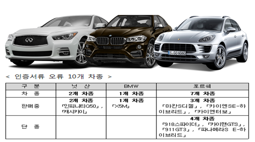 적발된 차량은 BMW 1개 차종과 닛산 2개 차종, 포르쉐 7개 차종이다. 특히 포르쉐는 판매 중인 10개 차종 중 7개 차종에서 서류 조작 또는 오류가 드러났다. 현재 판매 중인 마칸S 디젤, 카이엔 터보, 카이엔SE 하이브리드는 물론 918스파이더, 카이맨GTS, 911GT3, 파나메라SE 하이브리드 등 단종 모델도 포함됐다.