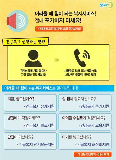 긴급복지 지원은 가정 내 주소득자의 사망, 학대, 화재 등으로 생계를 유지하기 곤란해진 가구에게 정부가 일시적인 도움을 주는 제도다. 유형에 따라 식료품비, 의복비 등 필요한 비용을 제공하거나 의료서비스, 임시주거지를 지원한다. 생계와 주거 등은 3개월 동안 지원되며 심의를 거쳐 3개월 연장할 수 있다. 의료지원은 기본 1회가 원칙이나 심의를 거쳐 1회를 더 받을 수 있다.