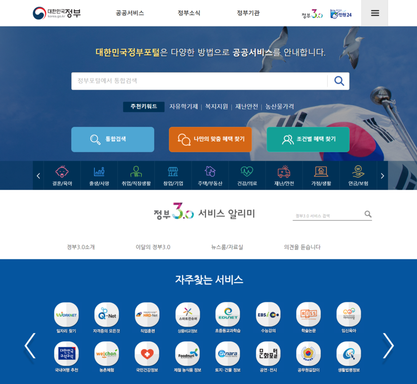대한민국정부포털은 결혼·육아, 취업·직장생활, 주택·부동산, 교육·지식, 농축수산인 등 정보를 제공한다. 정부3.0 서비스 알리미도 대한민국정부포털과 비슷한 정보를 담고 있다.