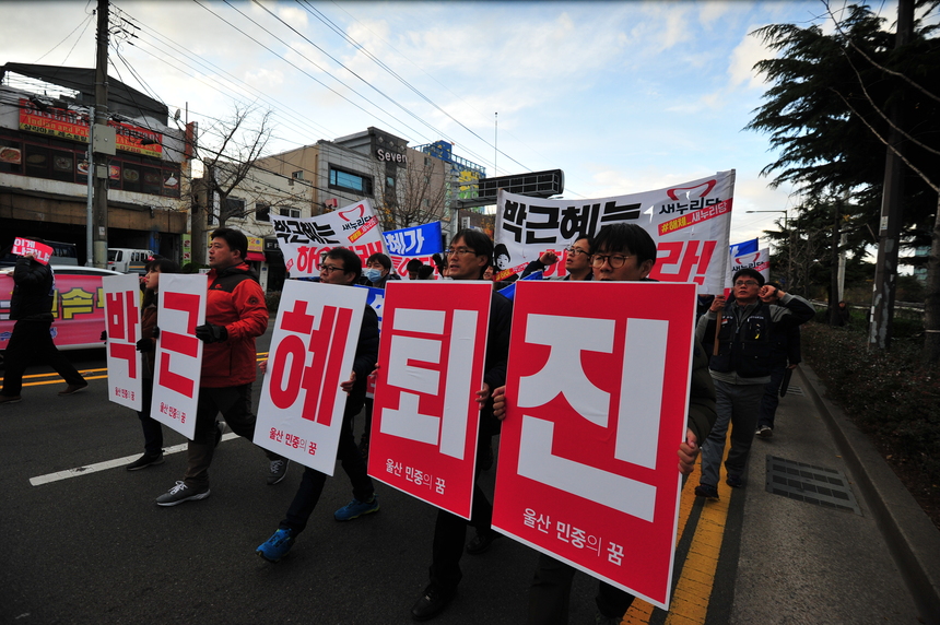 현대차 노조 관계자는 “최순실 국정농단 사태와 유신독재 시절의 정경유착을 부활시킨 박근혜 대통령은 당장 퇴진해야 한다”며 “울산 태화강역 앞까지 거리행진에 나선 후 정권 퇴진 집회를 진행한다”고 말했다.