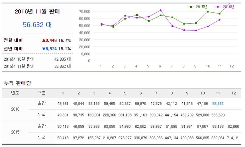 현대차 관계자는 “지난달은 개소세 인하 혜택, 신형 아반떼 출시 등 기저 효과의 영향으로 전년 동기와 비교해 국내 판매가 줄었다”면서 “본격 판매에 돌입하는 신형 그랜저를 중심으로 주요 차종에 대한 역량을 집중해 남은 한 달 동안 판매 확대에 힘쓰겠다. 내년에도 주력신차 모델이 출시되는 만큼 판매량은 점차 회복할 수 있을 것”이라고 말했다.