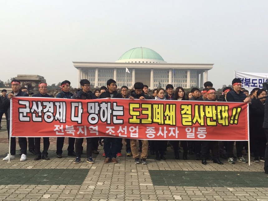 국회 앞에서 농성 중인 전북지역 조선업 종사자들은 “우리의 요구는 결코 지나친 것이 아니다. 하나뿐인 도크를 유지할 수 있는 최소한의 선박 건조 물량을 요구할 뿐이다. 내년부터 건조해야 할 LPG 운반선 2척을 울산으로 가져갔는데 이를 군산에 되돌려달라는 게 잘못된 것인가”라고 외쳤다.