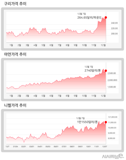 최근 주요 시장에서 원자재 가격이 가파른 상승세를 보이고 있다. 구리 선물 가격은 7일(이하 현지 시각) 뉴욕 상품 거래소(COMEX)에서 1파운드당 264.65로 지난달 7일 파운드당 230.95달러보다 14.5% 올랐다. 같은 날 런던금속거래소(LME)에서 아연 현물은 톤당 2740달러로 지난달 7일 2468달러보다 11% 상승했다. 니켈 역시 같은 기간 5.6% 오른 톤당 1만1550달러에 장을 마감했다.