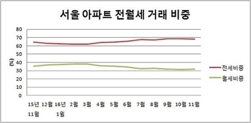 한편 전세물량이 늘어나면서 전체 임대차 계약에서 전세가 차지하는 비중도 커지고 있다. 서울부동산정보광장에 따르면 지난 11월 서울 아파트 임대차 거래에서 전세가 차지하는 비중은 68.24%로 지난해 11월(64.65%)보다 3.59%포인트 늘어났다. 반면 월세 비중은 지난해 11월 35.3%에서 올해 11월에는 31.8%로 떨어졌다.