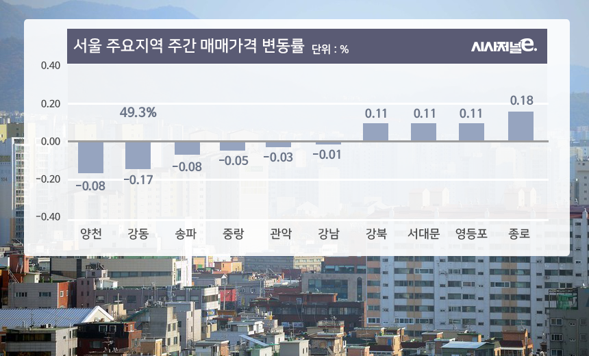 반면 △종로(0.18%) △영등포(0.11%) △서대문(0.11%) △강북(0.11%) 등은 상승했다. 매수세는 줄었지만 저가매물 거래 이후 매매가격이 소폭 올랐다는 게 부동산114의 설명이다.