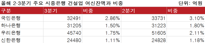 주요 시중은행들도 건설업 여신잔액을 줄이고 있다. 금감원에 따르면 올 3분기말 국민은행‧하나은행‧우리은행‧신한은행의 건설업 여신잔액은 13조 3916억원으로 나타났다. 이는 직전 분기 14조 1387억원 대비 5.28% 감소한 수치다. 같은 기간 각 은행이 거래하는 산업업종에서 건설업 여신이 차지하는 비중도 일제히 줄었다. 구체적으로 건설업 여신비중은 같은 기간 국민은행은 3.10%에서 2.86%, 하나은행은 1.80%에서 1.50%, 우리은행은 2.11%에서 1.75%, 신한은행은 1.18%에서 1.11%로 축소됐다.