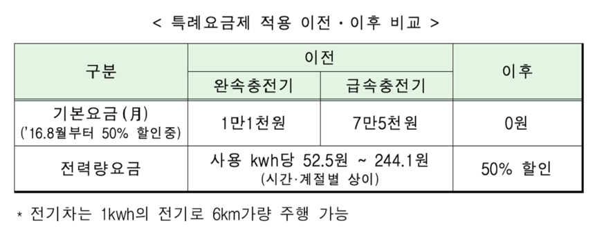 전기차 특례요금제는 전기차 충전기에 부과되는 전력요금 중 기본요금은 전부 면제되고, 시간당 전력량 요금도 50% 할인되는 제도다. 전기차 운전자가 연간 1만5000㎞를 운행한다고 가정할 때 특례요금제를 적용하면 전기 요금 부담은 기존 40만원에서 13만5000원으로 절반 넘게 줄어든다.
