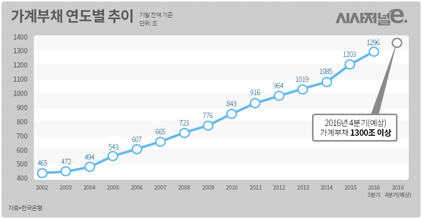 새해 우리나라 경제에 가장 큰 위험 요인을 꼽는다면 단연 가계부채가 1순위에 들어갈 것이다. 매년 가파른 증가세를 지속하며 이제는 1300조원까지 넘어섬으로써 우리 경제를 언제라도 파국으로 몰고 갈 수 있는 최대 위협 요인으로 부각되고 있다.