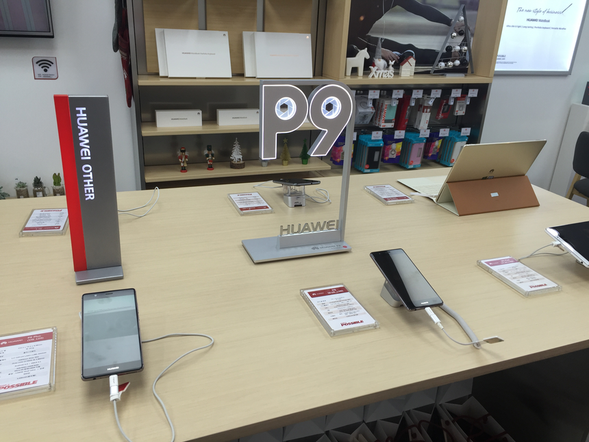 매장 체험 공간엔 프리미엄 스마트폰 P9과 P9플러스, KT 전용폰 비와이(Be Y), H폰 등이 비치돼 있다. 화웨이가 야심차게 내놓은 투인원(2in1) PC 메이트북도 있었다.
