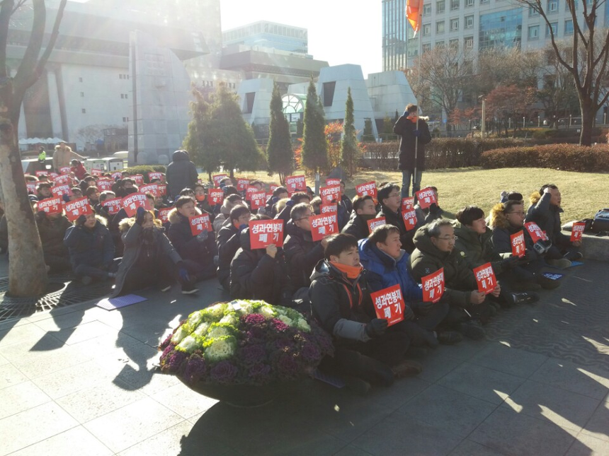 이날 사무금융노조는 서울 정부서울청사 앞에서 결의대회를 열었다. 김현정 사무금융노조 위원장은 "금융공기업에 이어 지난 12일 시중은행이 노조 동의 없이 성과연봉제를 이사회로 통과시켰다"며 "이제 2금융권 차례다. 이미 KB국민카드, KB손해보험, 서울보증보험 등에서 성과연봉제를 추진하고 있다"고 말했다. 이어 "성과연봉제는 금융 공공성을 고려하지 않고 경쟁만 심화시켜 불완전 판매 등을 일으킨다"며 "특히 노조와 합의 없이 일방적으로 진행하는 성과연봉제 도입을 반대한다"고 말했다.