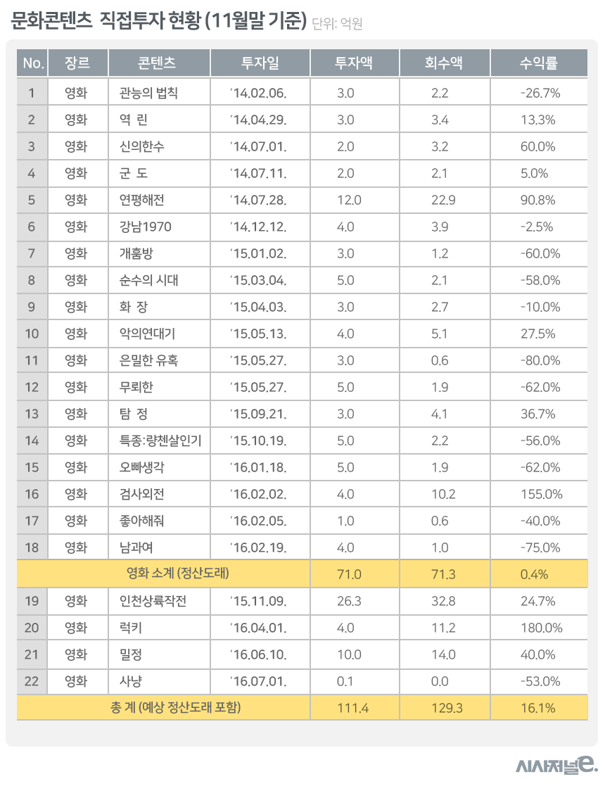 지난 2월 개봉한 황정민, 강동원 주연의 '검사외전'(2016.2)은 4억을 투자해 10억2000만원(수익률 155%)을 회수했다. 김무열, 이현우 주연의 '연평해전'(2015.6)은 12억 투자, 22억9000만원 회수로 90.8%수익률을 기록했다.