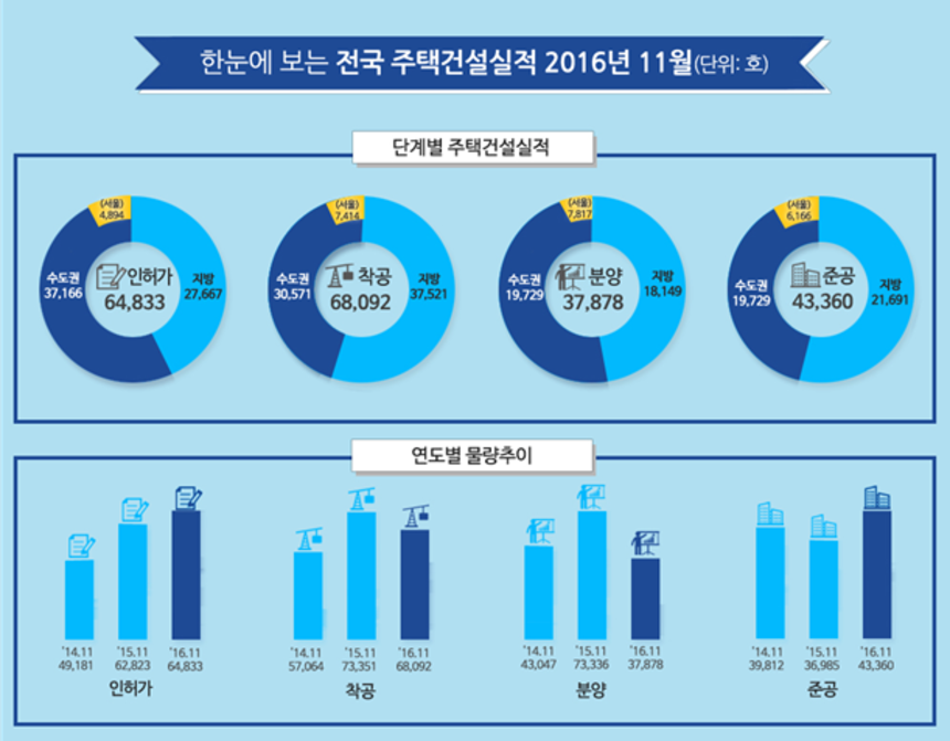 한편 11월 주택 준공 실적은 전국 4만3360가구로 전년 동기 대비 17.2% 늘었다. 특히 수도권 준공물량은 같은 기간 60% 증가했다. 지방 준공물량은 같은 기간 7.5% 감소했다.