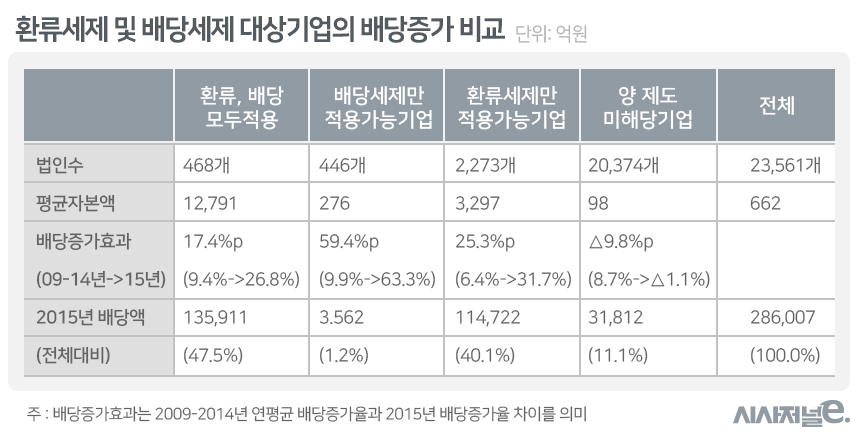실제 2015년 제도 시행 후 전체기업의 배당액은 전년대비 25.1% 증가했지만 임금(8.2%)과 투자(-4.3%)는 2009~14년 증가율(임금 9.6%, 투자 5.3%)보다 모두 낮은 수준을 기록한 것으로 조사됐다. 배당을 지급하는 기업이나 받는 주주 모두에게 세제인센티브를 주는 배당증대세제의 경우 매년 세수효과가 –1324억원에 이르러 제도의 조기폐지도 고려해야 한다고 주장했다. 임금의 경우에도 한번 인상되면 다시 낮추기 쉽지 않은 임금의 하방경직성을 고려할 때 이 제도가 내년까지 한시적으로 시행된다는 점에서 임금증가효과를 가져오기 힘들다고 지적했다.