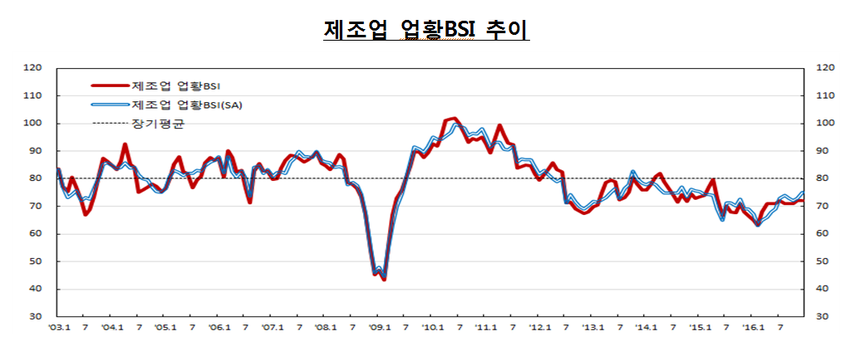 이 같은 체감 경기 악화는 올해 하반기 내내 지속되고 있다. 계절적 특성을 고려한 계절 조정 제조업 업황BSI를 보면 하반기 내내 장기평균 업황BSI 80을 넘지 못했다. 12월이 75로 최대치였지지만 장기 평균치와는 5포인트 차이가 난다. 장기평균 업황BSI가 2003부터 2015까지의 업황BSI 평균치임을 감안하면 체감 경기가 크게 위축됐다는 것을 알 수 있다. 하반기 비제조업 계절조정 업황 BSI도 장기 평균을 넘어서지 못했다.