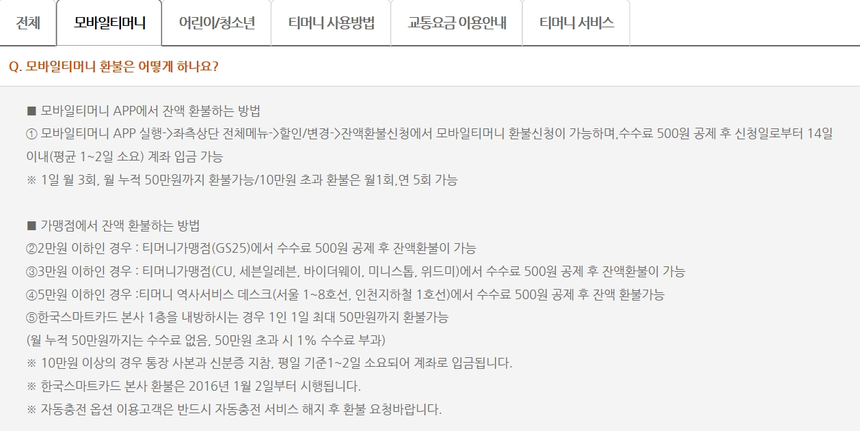 이런 사실을 알지 못한 사용자들은 넉넉히 충전해둔 잔액을 환불받기 위해 까다로운 절차를 거쳐야 한다. 인터넷 검색 포털에서 모바일 티머니를 검색하면 각종 잔액 환불 문의와 방법에 관한 글이 쏟아진다. 환불에 실패했다는 글도 쉽게 찾아볼 수 있다.