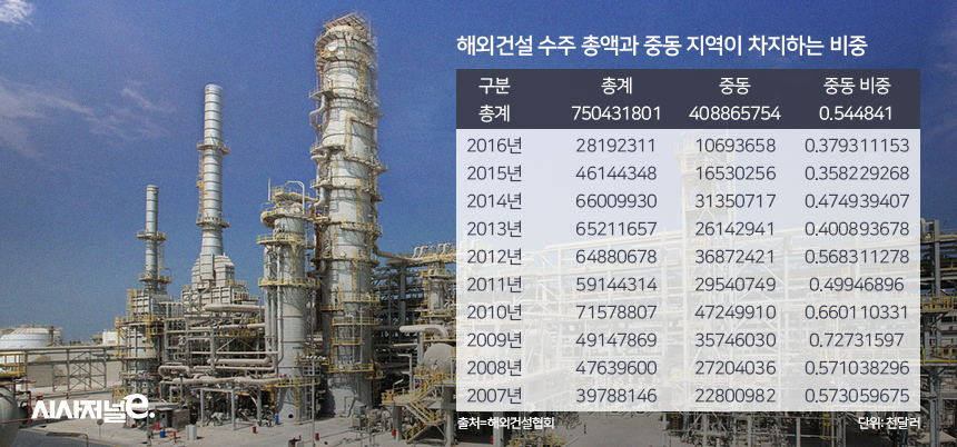 해외건설 수주가 부진한 주원인은 중동 발주물량 감소다. 지난해 중동 지역 해외건설 수주액은 107억 달러다. 직전해인 2014년(165억 달러) 대비 35% 감소한 금액이다. 지난해 중동 지역 수주금액은 2007년(228억 달러)과 비교해도 절반 가까이 줄었다. 중동 지역 발주물량은 연간 해외건설 수주액의 50% 이상을 차지한다. 중동 발주물량이 줄면서 해외건설 수주액도 동반 하락했다.