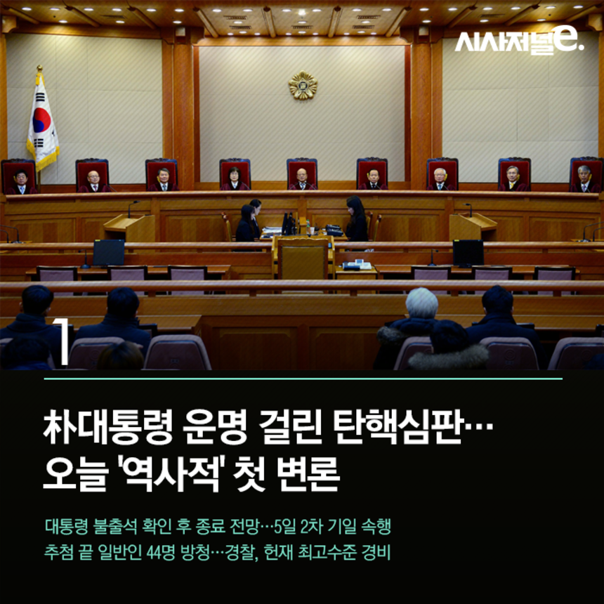朴대통령 운명 걸린 탄핵심판…오늘 '역사적' 첫 변론 저작권자 © 시사저널e 무단전재 및 재배포 금지 김태길 기자 kira1203@sisajournal-e.com 페이스북 인스타그램 유튜브 이메일(으)로 기사보내기 다른 공유 찾기 기사스크랩하기