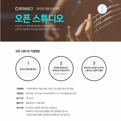 네이버 오픈스튜디오 프로젝트는 창작곡을 새롭게 제작하는 뮤지션 5명을 매달 선발해 1곡 음반을 제작하는 모든 과정을 후원한다. 현재 네이버 뮤지션리그에서 활동하며 창작곡이 있는 뮤지션이라면 참여 가능하다.