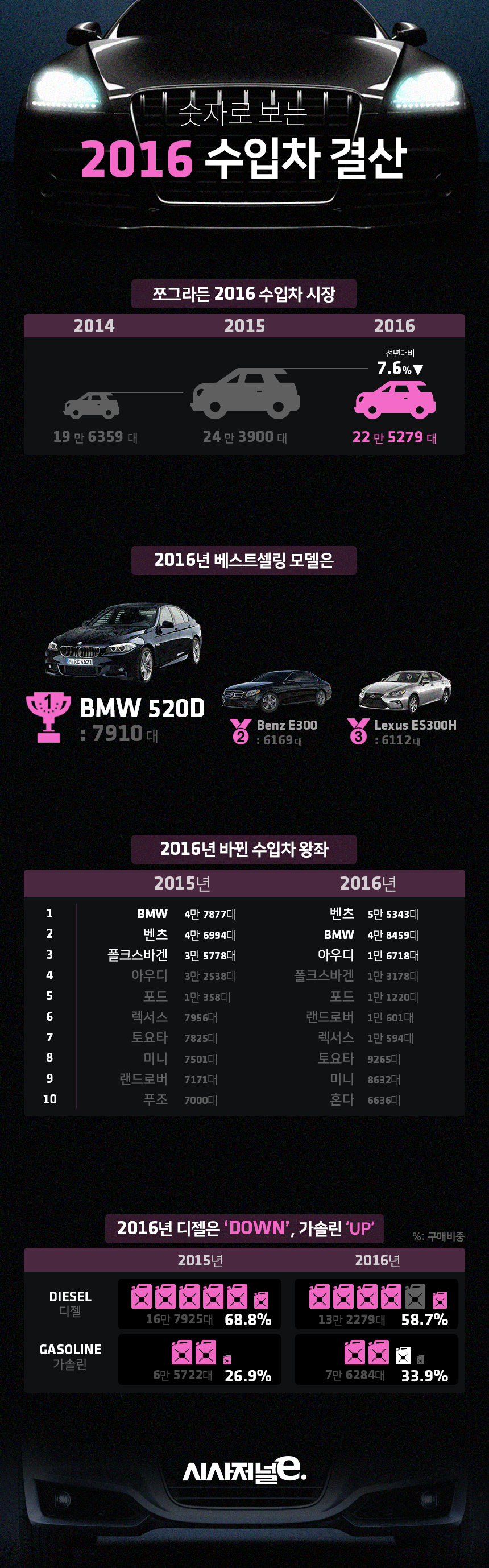 업황은 부진했지만 메르세데스 벤츠는 웃었다. 벤츠는 신형 E클래스 인기에 힘입어 2003년 한국법인 설립 이후 처음으로 BMW를 제치고 수입차 판매실적 1위를 차지했다. 랜드로버와 렉서스는 폴크스바겐이 주춤한 틈에 1만대 클럽 진입에 성공했다. 식어버린 디젤차 인기는 가솔린차가 고스란히 이어받았다.