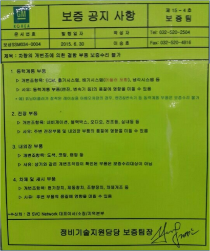한국GM 정비 사업소 관계자는 “보증 항목에 포함되는 배터리나 전자제어장치는 블랙박스 전원장치와 충돌이 불가피하다”면서 “정비기술지원담당 보증팀에서 보증수리 거절 항목을 지정해 뒀다”고 말했다.