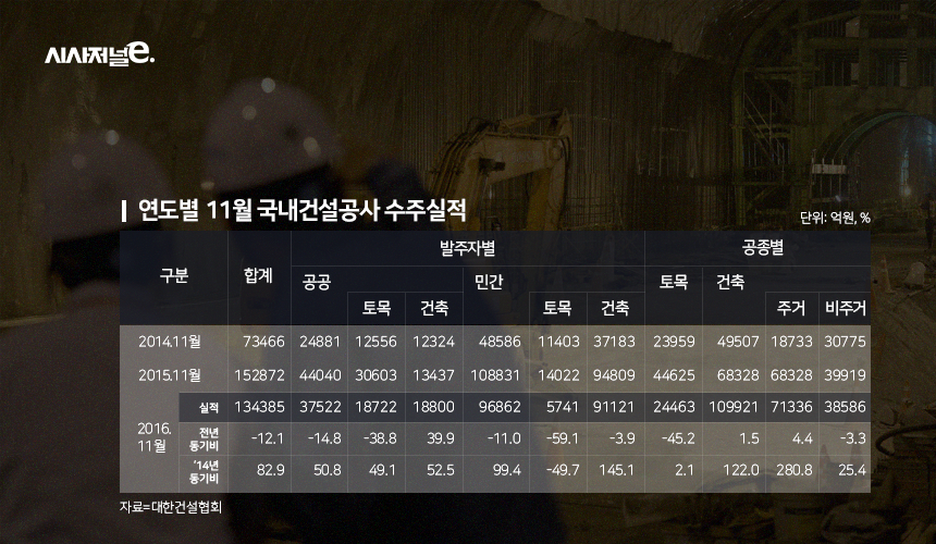 박철한 한국건설산업연구원 연구위원은 “상반기 미집행된 철도, 도로공사 발주가 7월부터 10월까지 일시에 집행됐다. 다만 11월 들어 해당 공사 발주량이 급감했다. 이에 11월 토목공종 수주감소폭이 큰 ‘반락효과’가 발생한 것”이라고 말했다.