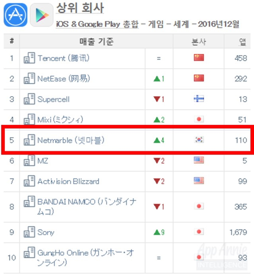 넷마블은 리니지2 레볼루션에 힘입어 세계 톱5 모바일게임 퍼블리셔로 등극했다. 글로벌 모바일 앱 통계 분석 사이트 앱애니가 발표한 지난해 12월 기준 ‘앱스토어·구글플레이 총합 글로벌 게임 회사·앱 매출 인덱스’에서 넷마블이 글로벌 퍼블리셔 5위에 오른 것이다.