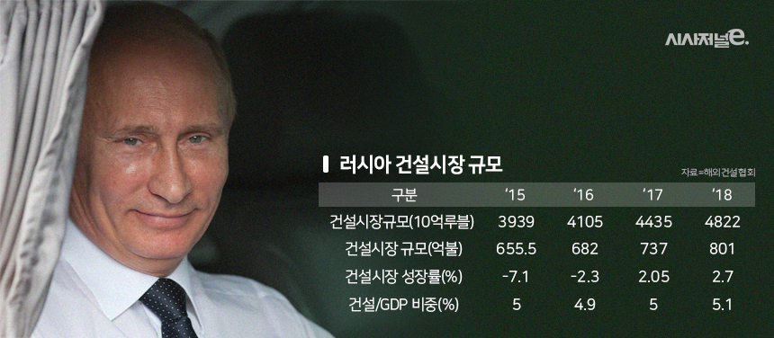그간 국내 건설사는 러시아 시장에서 의미 있는 성적을 올리지 못했다. 해외건설협회에 따르면 지난 3년 간 국내 업체의 러시아 건설 수주액은 2014년 56억 달러로 정점을 찍은 뒤, 2015년 7000만 달러, 2016년 3억8000만 달러로 하락세를 보였다. 지난 3년간 국내 건설사가 수주한 의미 있는 프로젝트는 대림산업의 비쇼츠크 액화 천연 가스 공장·옴스크 정유 공장 현대화 사업, 현대건설의 러시아 비료플랜트 공사 뿐이다.