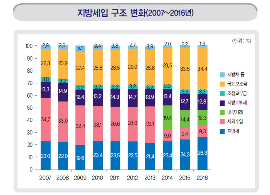 국고보조금은 지방교부세와 함께 지방재정을 이루는 두 축이다. 지자체 재량으로 사용할 수 있는 지방교부세와 달리 국고보조금은 정해진 목적 외에는 쓸 수 없다. 국가보조금 사업 규모가 빠르게 증가하면서 2009년부터 지방교부세 규모보다 국고보조금 규모가 커졌다. 이에 따라 지자체의 예산 집행 자율성도 악화되고 있다.