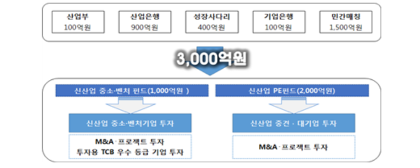 신산업펀드는 총 3000억원 규모로 조성하며, 산업부(한국산업기술진흥원), 산업은행, 성장사다리 펀드 등 정부․금융기관이 주요 출자자로 재원을 출자한다.
