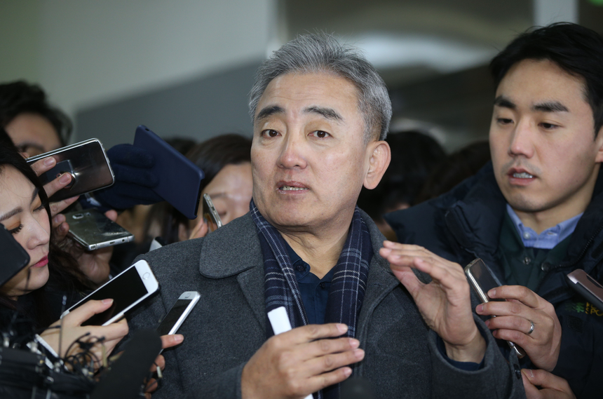 23일 유진룡 전 장관이 서울시 대치동 박영수 특별검사팀 사무실 앞에 모습을 드러냈다. 유 전 장관이 기자들 앞에 선건 국정농단 정국 이후 처음이다. 그는 그간 진행된 청문회에도 나서지 않았었다.