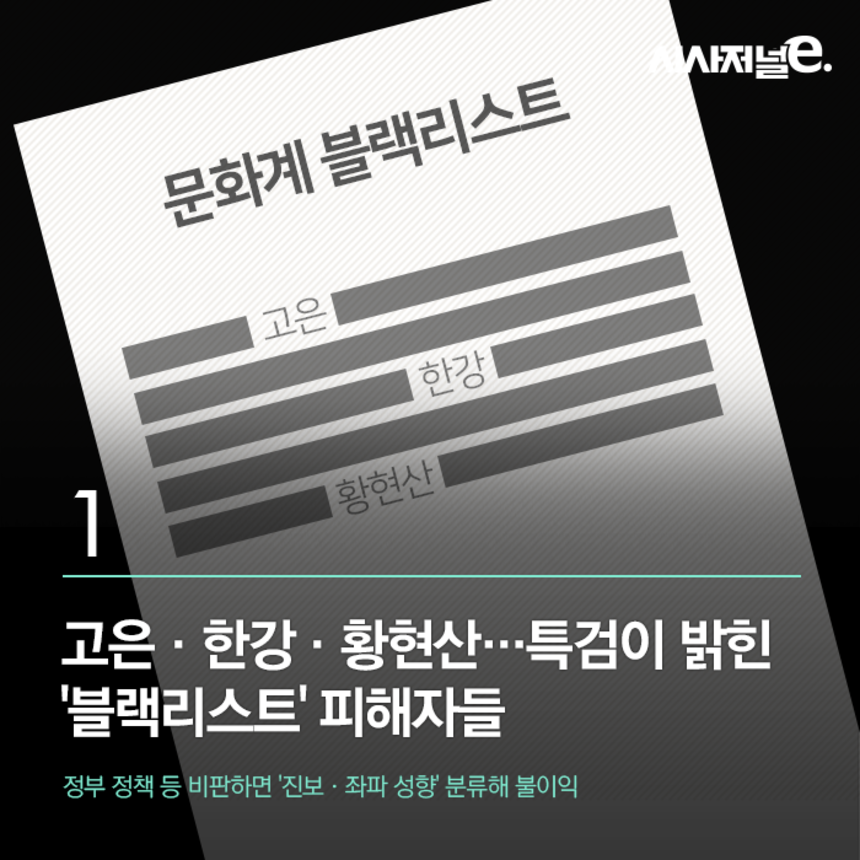 고은·한강·황현산…특검이 밝힌 '블랙리스트' 피해자들 저작권자 © 시사저널e 무단전재 및 재배포 금지 김태길 기자 kira1203@sisajournal-e.com 페이스북 인스타그램 유튜브 이메일(으)로 기사보내기 다른 공유 찾기 기사스크랩하기 개의 댓글 회원로그인 댓글 내용입력 댓글 정렬 최신순 추천순 답글순 BEST댓글 BEST 댓글 답글과 추천수를 합산하여 자동으로 노출됩니다. 닫기 더보기 댓글삭제 삭제한 댓글은 다시 복구할 수 없습니다. 그래도 삭제하시겠습니까? 비밀번호 닫기 댓글수정 댓글 수정은 작성 후 1분내에만 가능합니다. 본문 / 400 비밀번호 닫기 내 댓글 모음 닫기