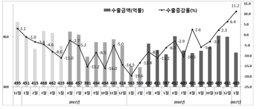 산업통상자원부가 1일 발표한 1월 수출입동향에 따르면 지난달 수출은 403억달러로 지난해 같은 기간보다 11.2% 늘었고, 수입은 371억달러로 18.6% 증가했다. 이에 따라 무역수지는 32억달러 흑자를 기록했다. 일평균 수출은 16.4% 증가해 2011년 8월 이후 65개월만에, 선박 제외 일평균 수출도 18.8% 늘어 2011년 9월 이후 64개월만에 최대증가율을 기록했다.