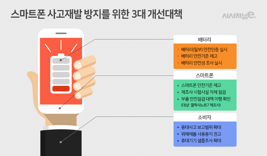 산업부는 이번 안전 대책을 크게 ▲리튬이온 배터리 안전관리 강화 ▲스마트폰 안전관리 강화 ▲사후 안전관리 개선 등 3개 부문으로 나눠 각 부문별로 3가지 추가 대책을 제시했다.
