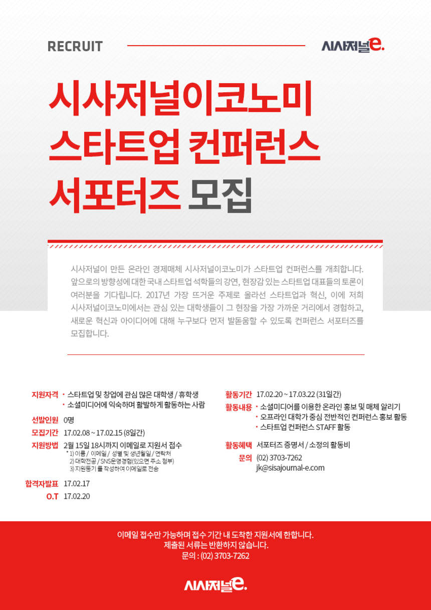 스타트업에 관심 많은 대학생·휴학생 대상 저작권자 © 시사저널e 무단전재 및 재배포 금지 이철현 기자 lee@sisajournal-e.com 페이스북 인스타그램 유튜브 이메일(으)로 기사보내기 다른 공유 찾기 기사스크랩하기