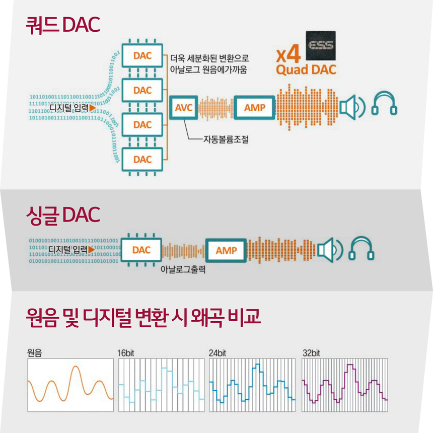 LG전자가 G6에 탑재할 쿼드 DAC은 좌우 이어폰 음향을 각각 세밀하게 조절해주고 잡음을 줄인 것이 특징이다. 음왜곡률이 명품 오디오 수준인 0.0002%까지 낮아졌고 음향 정보의 손실도 최소화했다. 정보의 손실이 적을수록 청취자는 원음에 가까운 깨끗한 소리를 들을 수 있다.