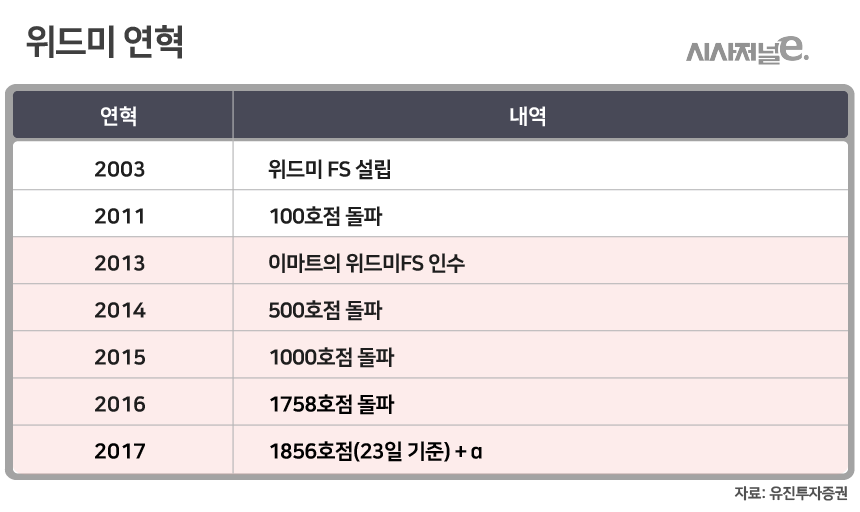 이마트위미드는 최근 점포를 빠르게 확장해 나가고 있다. 특히 2013년 이마트에 인수된 이후 출점에 속도가 붙고 있다. 23일 기준 이마트위드미는 1856개 점포를 운영하고 있다. 2003년 소규모 프랜차이즈 위드미FS설립 이후 100호점을 돌파하는데 10년이 걸린 것에 비교하면 분기당 100~200개 점포를 낸 셈이다. 서울역1호점 등 11개점은 이달 25일(토)에, 서울역 2호점은 다음달 4일(토) 새로 문을 연다.