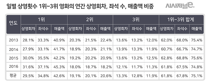 하지만 같은 기간 2, 3위 영화의 비중은 되레 줄었다. 상영횟수 2위 영화 점유율은 2013년 20.3%에서 지난해 18%로 하락했다. 같은 기간 3위 영화는 13.6%에서 12.1%로 1.5%포인트 내렸다. 이 때문에 1~3위를 합산한 집중률은 4년 간 대동소이했다.