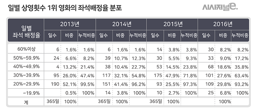 1위 영화로 쏠린 시장집중률을 살펴보기 위해 영진위 측이 꺼낸 카드는 좌석배정 비율 분포의 4년 간 비교분석이다. 영진위는 일별 상영횟수 1위 영화에 배정된 좌석이 전체 좌석수에서 차지하는 비중을 따져봤다.