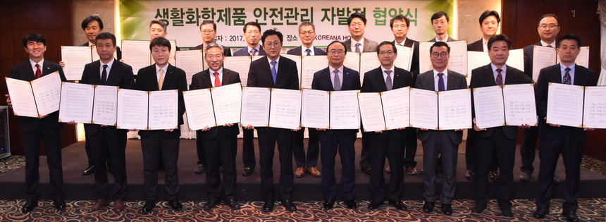환경부·식품의약품안전처·한국환경산업기술원과 국내 17개 생활화학제품 제조·수입·유통사는 28일 서울 중구 코리아나호텔에서 '생활화학제품 안전관리 자발적 협약'을 체결했다.
