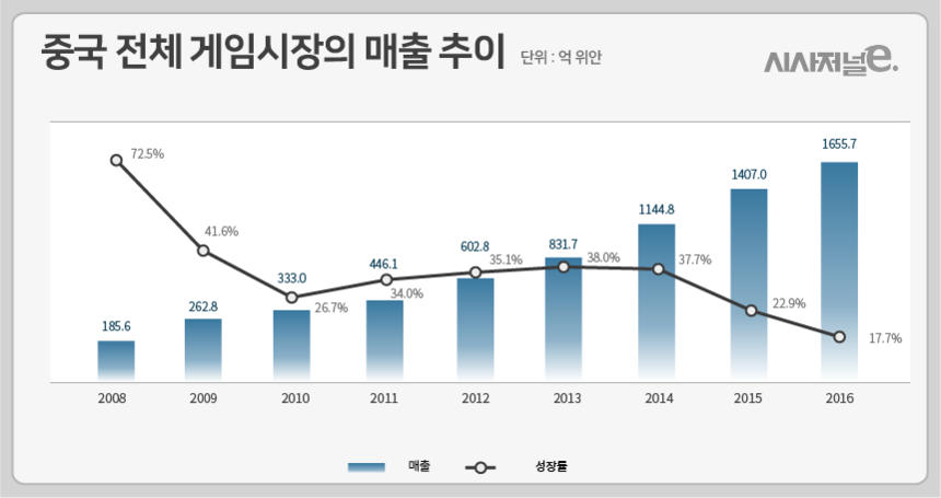 중국 시청각디지털출판협회 게임위원회(GPC)가 지난해 12월 발표한 자료에 따르면, 지난해 중국 게임시장 매출은 전년 대비 17.7% 성장한 1655억7000만 위안(약 27조7000억 원)을 기록했다. 중국은 지난 2008년 이후 매년 20%대에 가까운 성장률을 기록하고 있다.