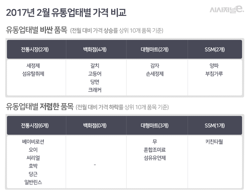 백화점에서 판매하는 갈치·고등어 등 4개 품목 가격은 다른 업태보다 높았다. 대형마트에서는 감자 등 2개 품목이, SSM에서는 양파 등 2개 품목이, 전통시장에서는 세정제 등 2개 품목이 비싼 것으로 조사됐다.