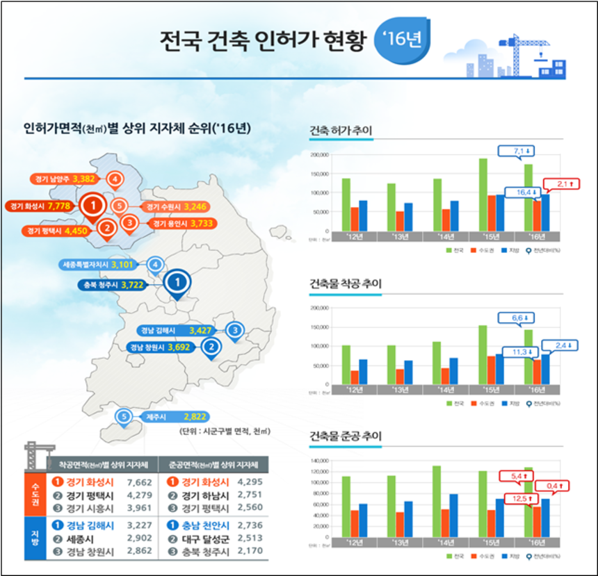국토부 관계자는 “지난해 건축 인허가 및 착공 면적의 감소, 준공 면적의 증가는 2015년도 큰 폭으로 증가된 (인)허가 물량에 따른 기저효과로 풀이된다”고 밝혔다.