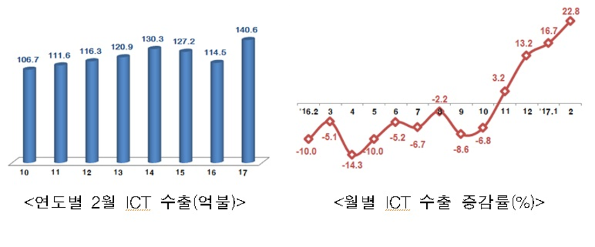 산업통상자원부가 15일 발표한 2월 ICT 수출입 동향에 따르면 지난달 ICT 수출은 140억6000만달러로 전년동기와 비교해 22.8% 증가한 것으로 잠정 집계됐다. 2월 ICT 수출액은 역대 가장 많은 것으로 증가율이 20%를 넘어선 것은 2010년 8월 이후 78개월 만에 처음이다.