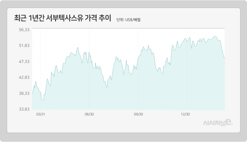 15일 정유업계와 증권가에 따르면 서부텍사스산원유(WTI) 4월 인도분은 뉴욕상업거래소에서 전일보다 1.4%(68센트) 하락한 배럴당 47.72달러에 거래를 마쳤다. 이날까지 7거래일 연속 WTI의 하락세가 이어지면서 배럴당 50달러 선 회복 기미가 보이지 않고 있다.